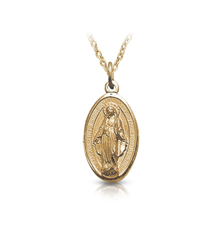 9/16" Oval satin finish 12K gold filled miraculous medal on a 16" stainless steel gold plated chain. The pendant features a plain border and a figure of Mary in the center, surrounded by the words, "O Mary, conceived without sin, pray for us who have recourse to thee." The figure of Mary also has light diamond drag engraved accents. On the back of the medal in a brushed finish is the letter M, representing Mary, surmounted by a cross representing the sacrifice of Jesus, and surrounded by twelve stars that represent the twelve apostles. Includes an elegant deluxe velour jewelry box.