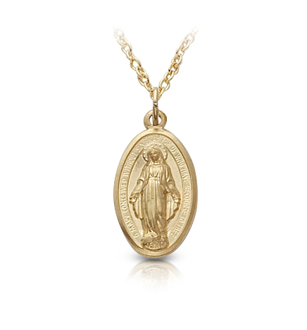 3/4" Oval satin finish 14K gold filled miraculous medal on a 18" stainless steel gold plated chain. The pendant features a plain border and a figure of Mary in the center, surrounded by the words, "O Mary, conceived without sin, pray for us who have recourse to thee." The figure of Mary also has light diamond drag engraved accents. On the back of the medal in a brushed finish is the letter M, representing Mary, surmounted by a cross representing the sacrifice of Jesus, and surrounded by twelve stars that represent the twelve apostles. Includes an elegant deluxe velour jewelry box.