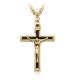 1 1/8" Polished finish 14K gold plated over sterling silver black enameled crucifix necklace on a 24" stainless steel gold plated chain. The crucifix pendant features a gold raised figure of Jesus Christ on the cross and is filled with black enamel in the center.
