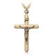 1 1/2" 14K gold plated over sterling silver polished and satin finish multi-line crucifix necklace on a 24" stainless steel gold plated chain. The crucifix pendant features a polished finish gold raised figure of Jesus Christ on the cross. The crucifix itself has engraved multi-line detailing and a satin finish.