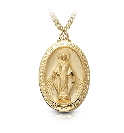 1 1/8" Polished and satin finish 14K gold plated over sterling silver oval Miraculous Medal on a 24" stainless steel gold plated chain. The oval medal features a raised and engraved image of Mary in the center, surrounded by the words, "O Mary, conceived without sin, pray for us who have recourse to thee,". The back of the medal features the Miraculous symbol in a brushed finish with a raised border. The symbol is comprised of the letter "M" with a cross on the top and two hearts and twelve stars. The "M" is an abbreviation for Mary, the cross represents the sacrifice of Jesus, and the two hearts are the immaculate heart of the Virgin Mary and for the sacred heart of Jesus. The twelve stars represent the apostles. Includes an elegant deluxe velour jewelry box.
