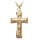 1 1/2" Polished and satin finish 14K gold plated over sterling silver polished edges crucifix necklace on a 24" stainless steel gold plated chain. The crucifix pendant features a satin finished raised figure of Jesus Christ on the cross as well as a satin finish inner cross. The border of the pendant or the outer cross has a polished finish.