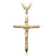 1 1/2" Satin finish 14K gold plated over sterling silver tube crucifix necklace on a 24" stainless steel gold plated chain. The crucifix pendant features a raised figure of Jesus Christ on the cross in the center and has tubular shaped ends. On the ends are diamond drag engraved details.