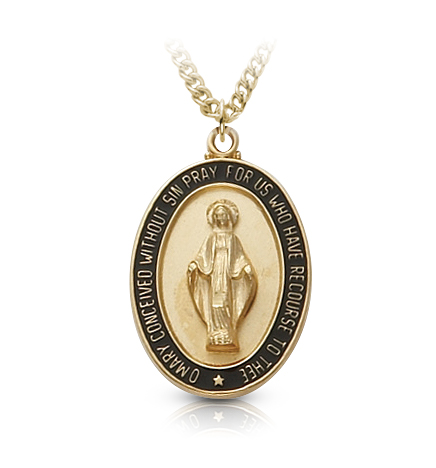 15/16" Polished and satin finish 18K gold plated over sterling silver oval Miraculous Medal with a black enameled border on a 24" stainless steel gold plated chain. The oval medal features a raised and engraved image of Mary in the center, surrounded by the words, "O Mary, conceived without sin, pray for us who have recourse to thee,". There is a black enameled border behind these words. The back of the medal features the Miraculous symbol in a brushed finish. The symbol is comprised of the letter "M" with a cross on the top and two hearts and twelve stars. The "M" is an abbreviation for Mary, the cross represents the sacrifice of Jesus, and the two hearts are the immaculate heart of the Virgin Mary and for the sacred heart of Jesus. The twelve stars represent the apostles. Includes an elegant deluxe velour jewelry box.