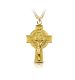 1 1/4" 14K gold plated over sterling silver polished and satin finish Celtic halo crucifix necklace on a 24" stainless steel gold plated chain. The crucifix pendant features a polished finish gold raised figure of Jesus Christ on the cross and has Celtic knot detailing on each point of the cross. In the background is a halo circle. The halo circle and cross both have a satin finish.