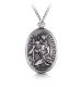 15/16" x 9/16" Brass with silver finish antiqued oval St. Christopher medal on a 20" stainless steel rhodium plated chain. The pendant features a raised figure of St. Christopher, who is shown carrying a child on his shoulders. Around the figure are the words, "Saint Christopher". Known as the patron saint of travelers, a St. Christopher medal is traditionally worn by the wearer as a form of protection. The back of the medal is blank and flat.