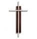 7" Polished silver plated and dark brown painted wood wedding wall cross. The design is a thin silver plated block cross inlaid in a dark brown painted cross, with two interlocking rings in the center to symbolize commitment of a couple to live and grow in God's grace. The back of the wall cross has a key hole to hang. Wall cross comes boxed.
