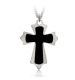 1 1/2" Antiqued and enamel finish black cross necklace on 24" stainless steel rhodium plated chain. The cross pendant features a black enameled inner cross bordered by an antiqued finish silver outer cross. The cross also has budded ends as part of the detailing.