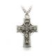 1" Sterling silver antique finish Celtic crucifix necklace on an 18" stainless steel rhodium plated chain. The crucifix pendant features a silver raised figure of Jesus Christ on the cross and has raised diamond shape accents on each point of the cross. In the background is a halo circle. Includes an elegant deluxe velour jewelry box.