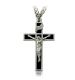 1" Polished finish sterling silver black enameled with silver borders crucifix necklace on a 20" stainless steel rhodium plated chain. The crucifix pendant features a silver raised figure of Jesus Christ on the cross with black enamel filling in the background.