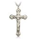 1 15/16" Satin and antique finish sterling silver clover ends crucifix necklace on a 24" stainless steel rhodium plated chain. The crucifix pendant features black antique detailing and a raised figure of Jesus Christ on the cross. On the ends of the crucifix are three leaf clovers with diamond drag engraved detailing.