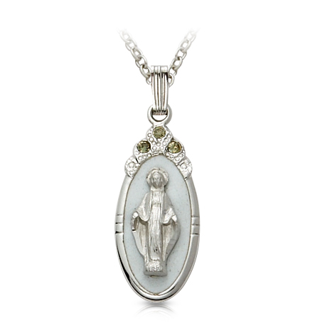 1" Polished, satin, and enameled finish sterling silver oval miraculous medal on an 18" stainless steel rhodium plated chain. The pendant features a polished finish border with white glass stones at the top. In the center, surrounded by white enamel, is a satin finished figure of Mary. On the back of the pendant in a brushed finish is the letter M, representing Mary, surmounted by a cross representing the sacrifice of Jesus, and surrounded by twelve stars that represent the twelve apostles. Includes an elegant deluxe velour jewelry box.