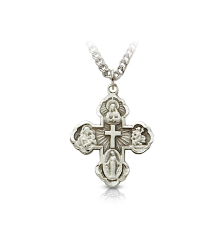 11/16" Satin and antique finish sterling silver Four Way medal on an 18" stainless steel rhodium plated chain. The medal pendant is shaped like a cross with curved ends. In the center is a raised and engraved cross with sunbursts encircled by four symbols: St. Christopher, the Sacred Heart, St. Joseph, and the Miraculous Medal. On the back of the medal with a slight antiqued finish there is an image of Our Lady of Mount Carmel on top followed by the Miraculous symbol on the bottom. The Miraculous symbol is comprised of the letter "M" with a cross on the top and two hearts and twelve stars. The "M" is an abbreviation for Mary, the cross represents the sacrifice of Jesus, and the two hearts are the immaculate heart of the Virgin Mary and for the sacred heart of Jesus. The twelve stars represent the apostles. Includes an elegant deluxe velour jewelry box.