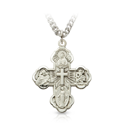 The Four Way Medal combines four medals that are significant to the Catholic Faith. The four symbols that make up the medal (each on an end of the cross) are: The Sacred Heart of Jesus which shows Jesus pointing to his exposed heart, which is crowned with thorns. This is a reminder of the great sacrifice Jesus made. St. Joseph is shown holding the baby Jesus and a lily. His image represents guardianship and protection, and the lily is a symbol of purity and righteousness. St. Christopher carries the baby Jesus and represents how we must carry the teachings of Jesus with us wherever we go. He also is the patron saint of long journeys. Finally, the Miraculous Medal depicts the Virgin Mary standing on top of the world crushing a snake. This represents the origins of Jesus, his kingship over the world, and how he conquered evil.