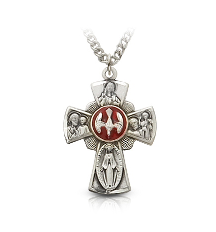 7/8" Satin and antique finish sterling silver engraved red enameled Five Way medal with a dove in the center of the cross on an 18" stainless steel rhodium plated chain. The medal pendant is shaped like a cross with curved ends and has five raised and engraved symbols on the front, including the dove, St. Christopher, the Sacred Heart, St. Joseph, and the Miraculous Medal. The dove in the center is surrounded by red enamel - the color red is often associated with the Holy Spirit, which the dove is a symbol of. The dove in the center also makes this a Five Way medal. On the back in a plain brushed finish is an image of Our Lady of Mount Carmel on top, followed by the text, "I am a Catholic, Please Call a Priest," which signifies the wearer's wish in case of an emergency. On the bottom is the Miraculous symbol. The Our Lady symbol on the back also makes this medal scapular. Includes an elegant deluxe velour jewelry box.