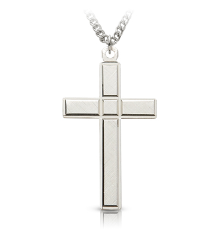 1 5/16" Polished and satin finish sterling silver with engraved detailing cross necklace on 24" stainless steel rhodium plated chain. The cross pendant features intricate cross-hatched engraving, giving it an elegant design. The engraving is satin finished and the cross has a polished finish border. Includes an elegant deluxe velour jewelry box.