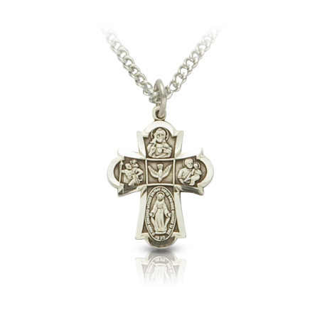 The Four Way Medal combines four medals that are significant to the Catholic Faith. The four symbols that make up the medal (each on an end of the cross) are: The Sacred Heart of Jesus which shows Jesus pointing to his exposed heart, which is crowned with thorns. This is a reminder of the great sacrifice Jesus made. St. Joseph is shown holding the baby Jesus and a lily. His image represents guardianship and protection, and the lily is a symbol of purity and righteousness. St. Christopher carries the baby Jesus and represents how we must carry the teachings of Jesus with us wherever we go. He also is the patron saint of long journeys. Finally, the Miraculous Medal depicts the Virgin Mary standing on top of the world crushing a snake. This represents the origins of Jesus, his kingship over the world, and how he conquered evil.