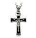 1" Polished finish sterling silver flared ends black enameled crucifix necklace on a 20" stainless steel rhodium plated chain. The crucifix pendant features a silver raised figure of Jesus Christ on the cross in the center, has black enameled filling in the back, and is outlined by a silver border.