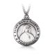 15/16" Antiqued finish sterling silver St. Maria Faustina round medal on a 20" stainless steel rhodium plated chain. The pendant features a raised profile image of Saint Maria Faustina on the front. On the top and bottom of the pendant are the words, "Saint Maria Faustina Pray For Us" in black text. The left and right sides of the medal feature engraved and antiqued stars. The back of the medal is blank with a brushed finish. Includes an elegant deluxe velour jewelry box.