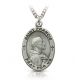 1" Satin and antiqued finish sterling silver St. Francis oval medal on a 24" stainless steel rhodium plated chain. The pendant features a raised profile image of Saint Francis on the front, who is shown in profile praying. On the top and bottom of the pendant are the words, "Saint Francis Pray For Us". The back of the medal is blank with a brushed finish but can be engraved with the message of your choice.
