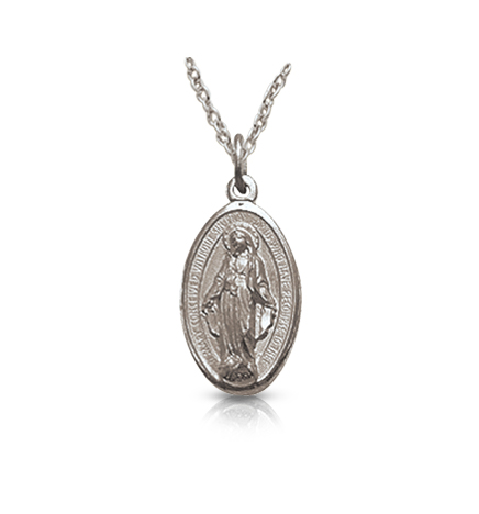 9/16" Satin and antique finish sterling silver oval Miraculous Medal on a 16" stainless steel rhodium plated chain. The oval medal features a raised and engraved image of Mary in the center, surrounded by the words, "O Mary, conceived without sin, pray for us who have recourse to thee,". The back of the medal features the Miraculous symbol in an antiqued finish. The symbol is comprised of the letter "M" with a cross on the top and two hearts and twelve stars. The "M" is an abbreviation for Mary, the cross represents the sacrifice of Jesus, and the two hearts are the immaculate heart of the Virgin Mary and for the sacred heart of Jesus. The twelve stars represent the apostles. Includes an elegant deluxe velour jewelry box.