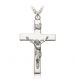 1 11/16" Sterling silver polished finish crucifix necklace with Our Father (The Lord's Prayer) engraved on back on a 24" stainless steel rhodium plated chain. The crucifix pendant features a silver raised figure of Jesus Christ on the cross. Includes an elegant deluxe velour jewelry box.