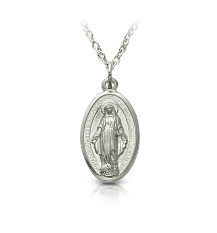 3/4" Satin and antique finish sterling silver oval Miraculous Medal on a 18" stainless steel rhodium plated chain. The oval medal features a raised and engraved image of Mary in the center, surrounded by the words, "O Mary, conceived without sin, pray for us who have recourse to thee,". The back of the medal features the Miraculous symbol in an antiqued finish. The symbol is comprised of the letter "M" with a cross on the top and two hearts and twelve stars. The "M" is an abbreviation for Mary, the cross represents the sacrifice of Jesus, and the two hearts are the immaculate heart of the Virgin Mary and for the sacred heart of Jesus. The twelve stars represent the apostles. Includes an elegant deluxe velour jewelry box.