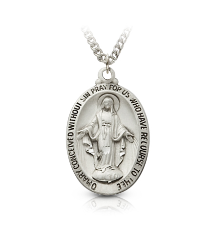 7/8" Satin finish sterling silver oval Miraculous Medal on a 20" stainless steel rhodium plated chain. The oval medal features a raised and engraved image of Mary in the center, surrounded by the words, "O Mary, conceived without sin, pray for us who have recourse to thee,". The back of the medal features the Miraculous symbol in a brushed finish. The symbol is comprised of the letter "M" with a cross on the top and two hearts and twelve stars. The "M" is an abbreviation for Mary, the cross represents the sacrifice of Jesus, and the two hearts are the immaculate heart of the Virgin Mary and for the sacred heart of Jesus. The twelve stars represent the apostles. Includes an elegant deluxe velour jewelry box.
