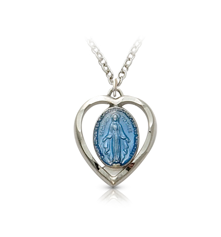 • 11/16" Heart Shaped Pendant with Miraculous Medal Center and Blue Enamel Overlay