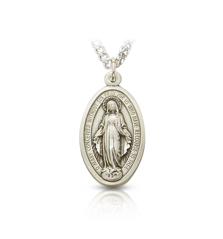 15/16" Satin and antique finish sterling silver oval Miraculous Medal on a 18" stainless steel rhodium plated chain. The oval medal features a raised and engraved image of Mary in the center, surrounded by the words, "O Mary, conceived without sin, pray for us who have recourse to thee,". The back of the medal features the Miraculous symbol in an antiqued finish. The symbol is comprised of the letter "M" with a cross on the top and two hearts and twelve stars. The "M" is an abbreviation for Mary, the cross represents the sacrifice of Jesus, and the two hearts are the immaculate heart of the Virgin Mary and for the sacred heart of Jesus. The twelve stars represent the apostles. Includes an elegant deluxe velour jewelry box.