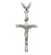 1 3/8" Satin and antique finish sterling silver straight crucifix necklace on a 24" stainless steel rhodium plated chain. The crucifix pendant features a satin raised figure of Jesus Christ on the cross and has antique finishing on it. On each end of the cross there are diamond drag engraved points.