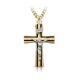 1" Two-tone polished finish 14K gold plated over sterling silver black enameled crucifix necklace on a 20" stainless steel gold plated chain. The gold crucifix pendant features black enameled detailing in a multi-line design and also has a raised silver figure of Jesus Christ on the cross on it.