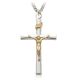 1 1/4" Two-tone polished finish sterling silver flared ends crucifix necklace on a 24" stainless steel rhodium plated chain. The crucifix pendant features a silver cross and a gold raised figure of Jesus Christ on the cross. The ends of the cross are flared.